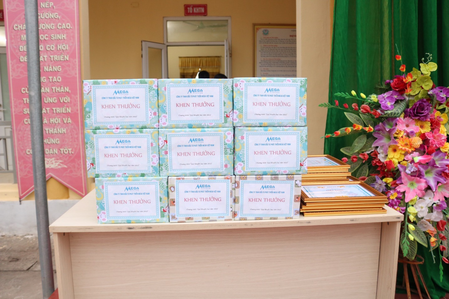 Hình ảnh những món quà như đèn học, tập vở và bằng khen của “Quỹ khuyến học Mega”