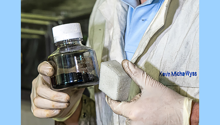 Ph.D. student Kevin Wyss holds a bottle of graphene and a piece of polyurethane foam. Photo by: Jeff Fitlow